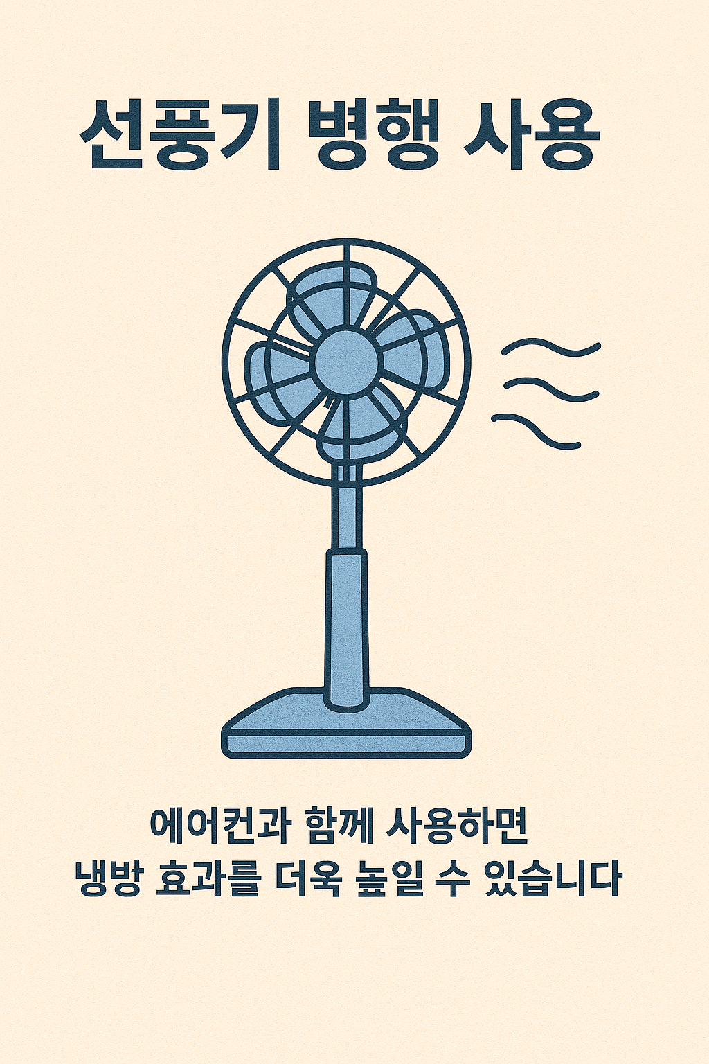 - 선풍기나 서큘레이터를 함께 사용하면 찬 공기가 빠르게 퍼져 냉방 시간이 단축됩니다.