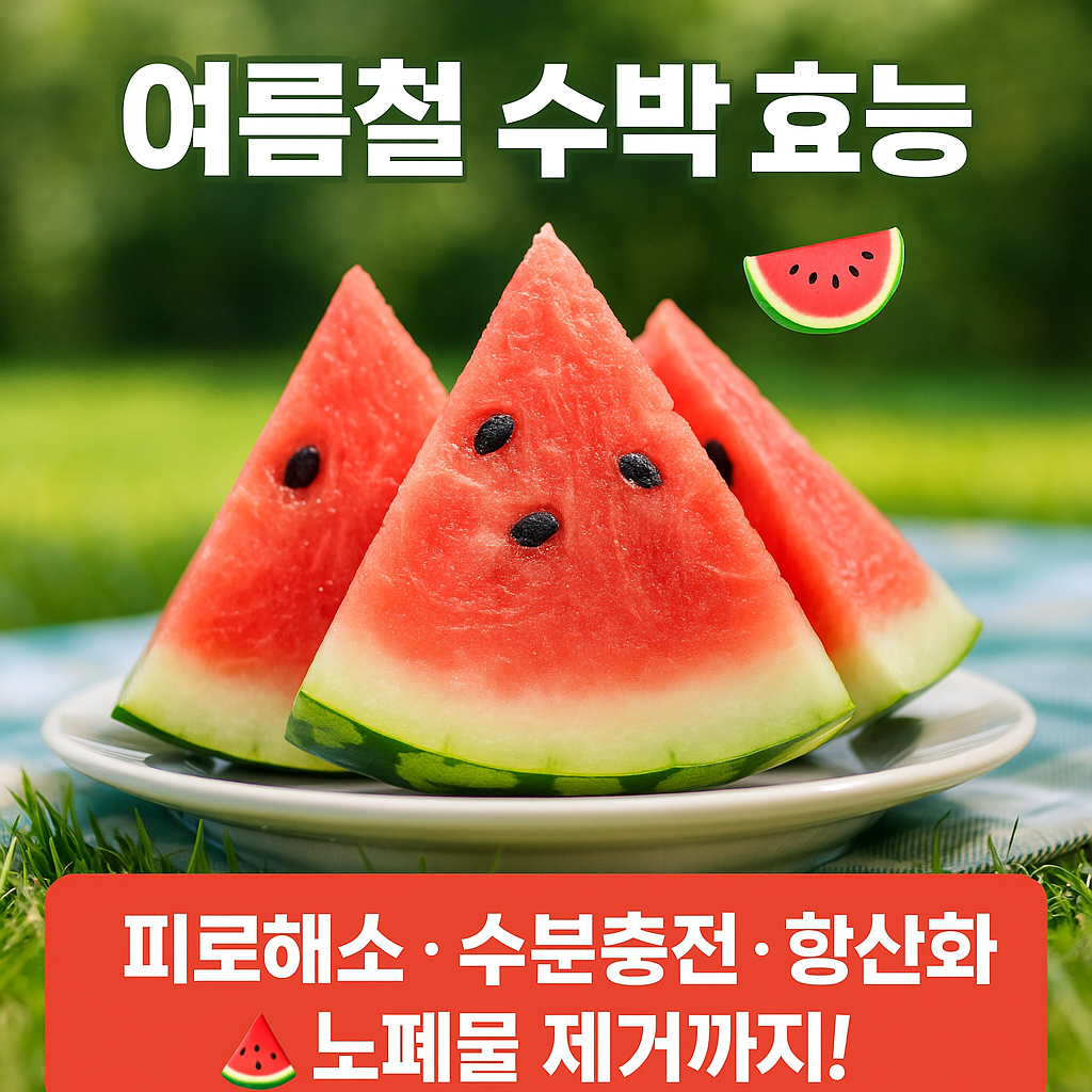 “수박이 단순한 여름 과일이라고요? 알고 보면 여름철 자연 보약입니다! 수분 보충은 기본, 항산화 작용과 노폐물 배출, 피부 미용까지 도와주는 수박의 놀라운 효능 10가지를 정리했습니다. 여름을 건강하게 보내고 싶다면 지금 확인해 보세요!”